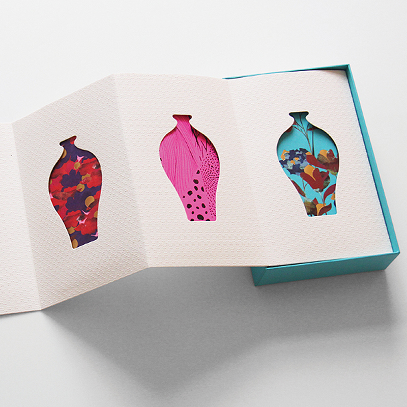 Indvendigt afslører boksen et visuelt slående design med klip-ud af vaseformer, hver fyldt med unikke og farverige mønstre, der fremkalder kulturel rigdom og kunstnerisk kreativitet. De prægede detaljer opnås ved hjælp af en præcisionsprægningsproces, der giver overfladen en raffineret 3D -struktur, hvilket forbedrer den samlede æstetik. Kombinationen af livligenuancer og indviklede design gør dette produkt ideelt til gave-At give lejligheder, luksus detailskærme og salgsfremmende emballage.